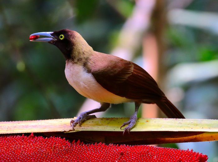 Hablamos de un pájaro de tamaño medio, que mide alrededor de 34 cm y tiene un color marrón granate con la zona superior de la espalda amarillenta. Además, el macho se distingue por tener una garganta verdosa y 2 antenas negras que sobresalen de su cuerpo. Este tipo de ave presenta también una cola trasera blanca y una pequeña cresta trasera de color amarillo. En cambio, la hembra tiene unos colores más marrones y su parte inferior es blanca, sus ojos son una mezcla de amarillo con verde con una pupila negra.